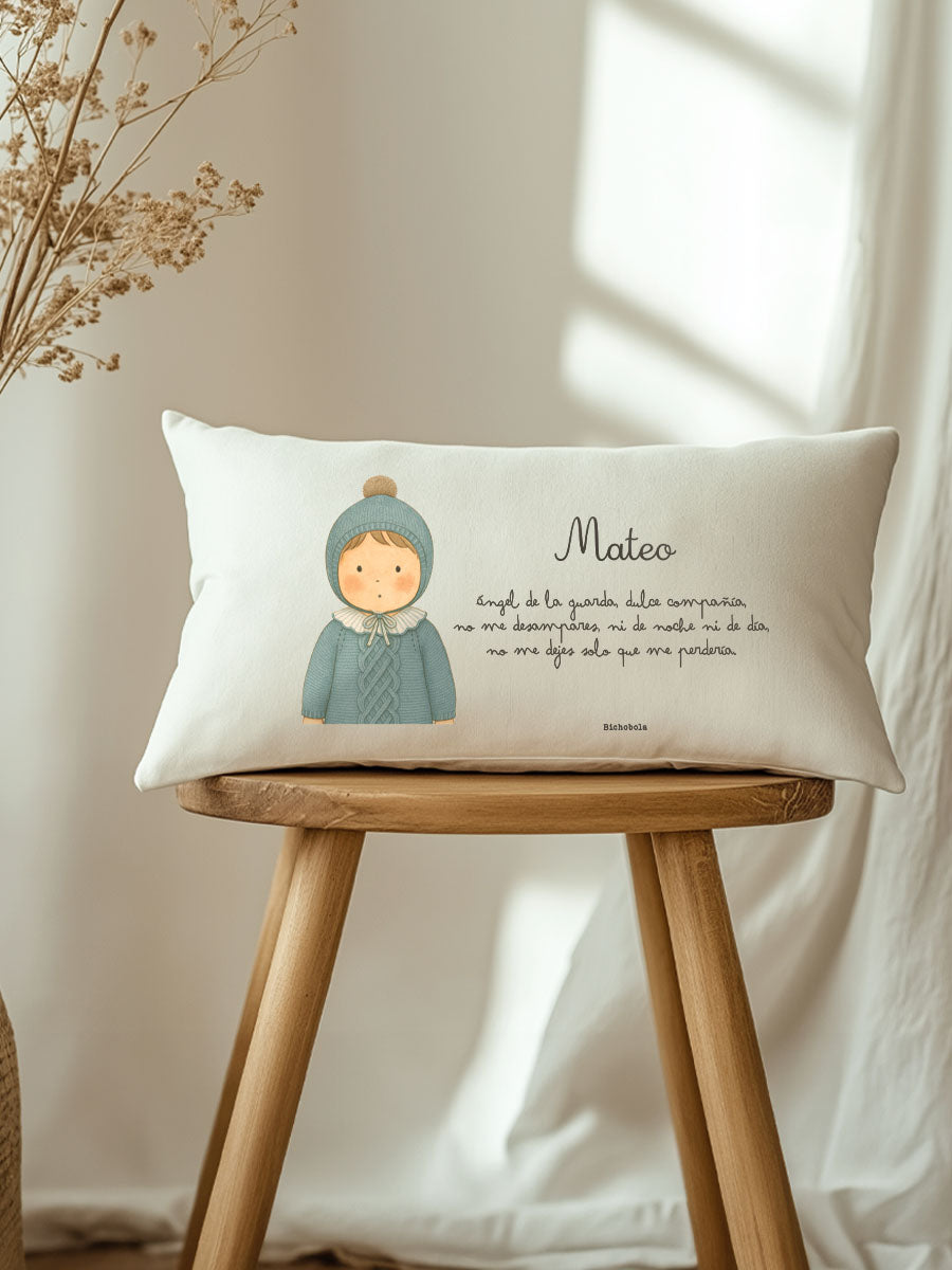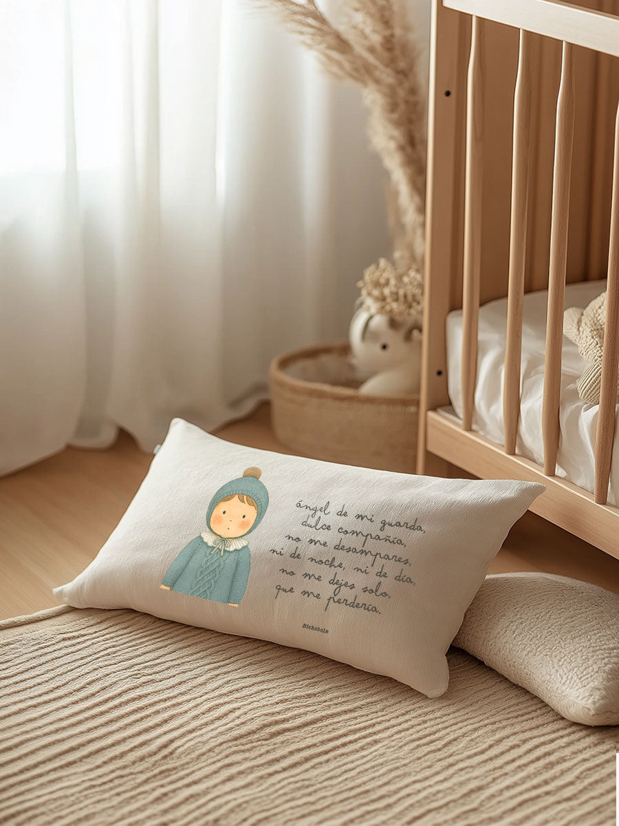 El cojín con la oración de "Ángel de la guarda" está hecho con algodón 100%. Se puede personalizar con el nombre para que lo sueños sean aún más dulces.