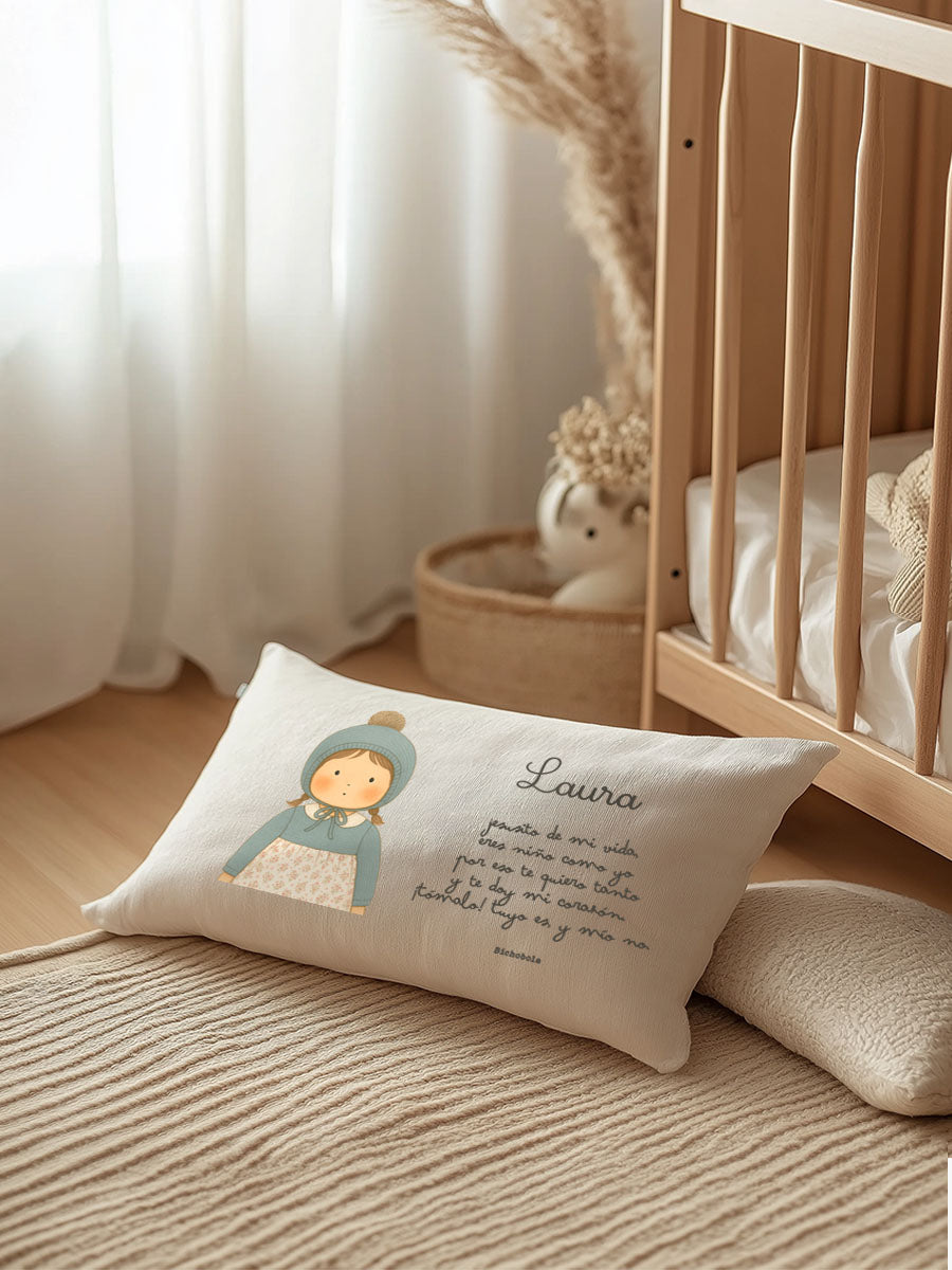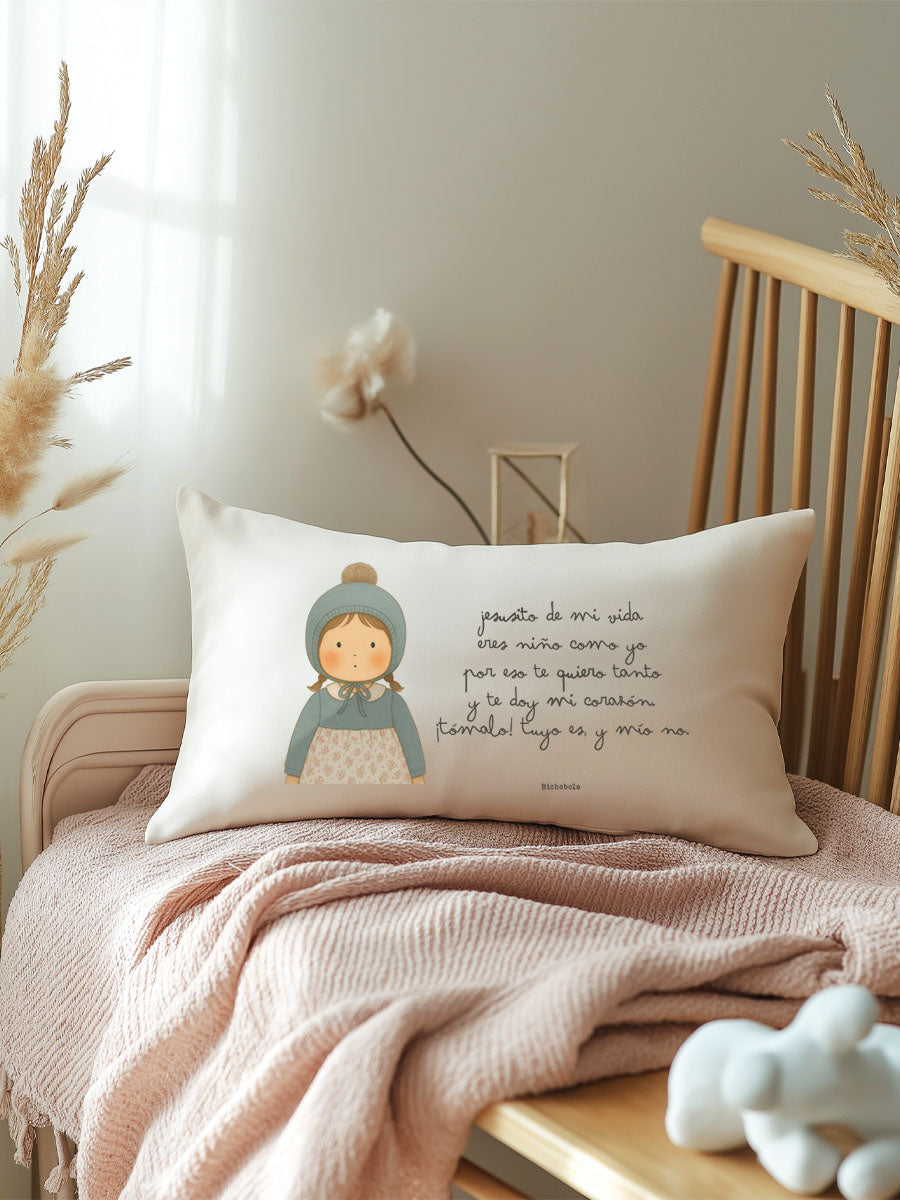 El cojín con la oración de "Jesusito de mi vida" está hecho con algodón 100%. Se puede personalizar con el nombre para que lo sueños sean aún más dulces