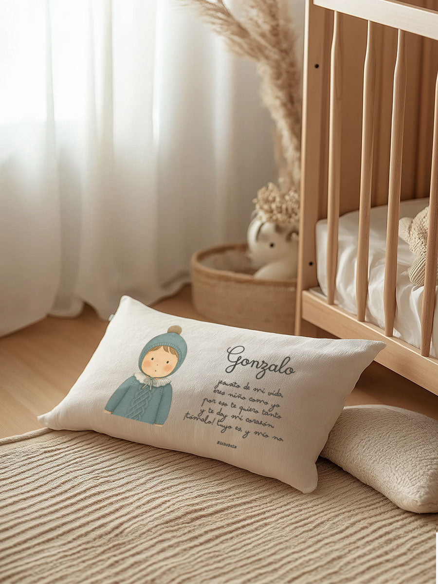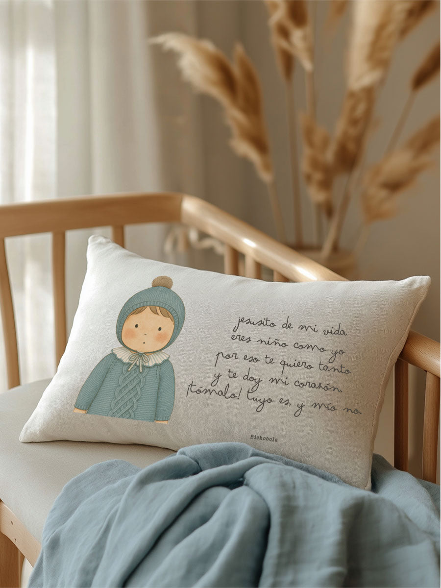 El cojín con la oración de "Jesusito de mi vida" está hecho con algodón 100%. Se puede personalizar con el nombre para que lo sueños sean aún más dulces