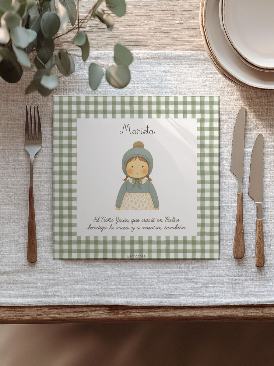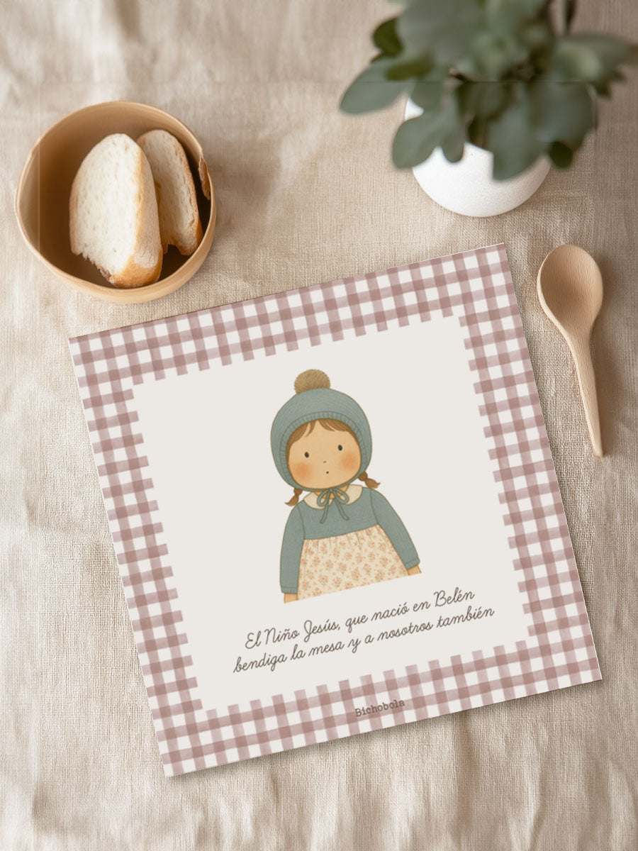 Los manteles individuales son ideales para cualquier mesa familiar, desayuno, comida, merienda o cena. Los puedes personalizar con tu diseño favorito y el nombre. Además, los más pequeños aprenderán poco a poco a bendecir la mesa.