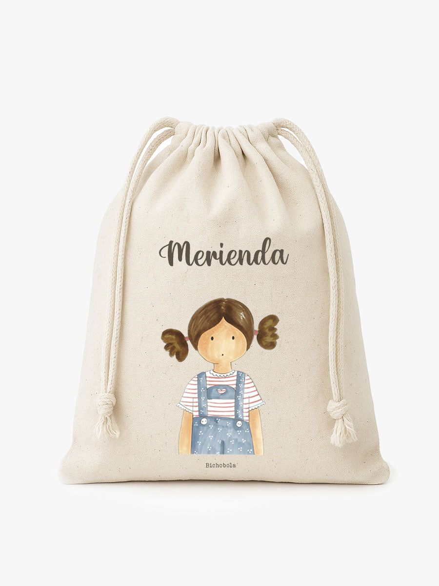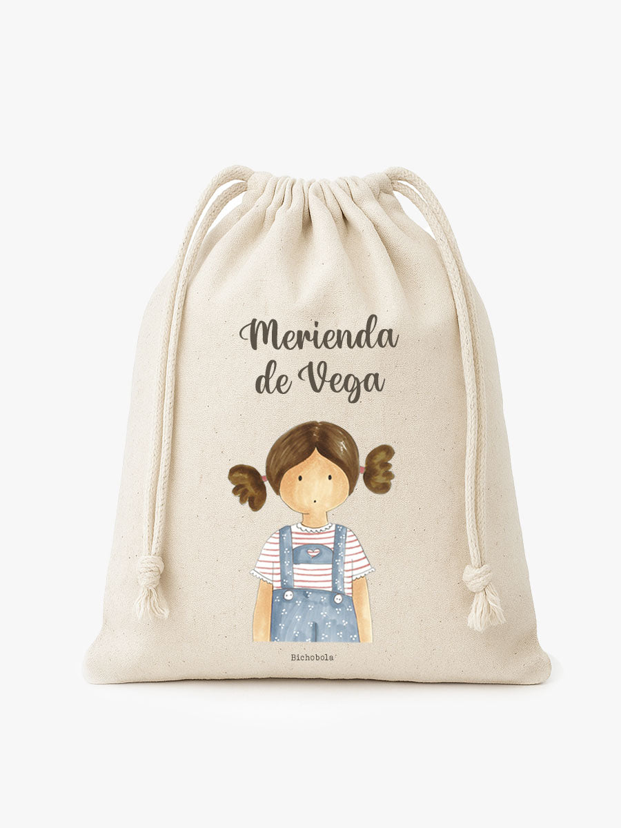 Nuestro saquito de merienda, es ideal para que los niños puedan llevar la merienda del colegio de una forma organizada y cómoda. Se puede elegir el diseño que más te guste y personalizar con el nombre del niño para que lo tenga siempre localizado. Está fabricado con algodón 100% y se cierra con cuerdas.