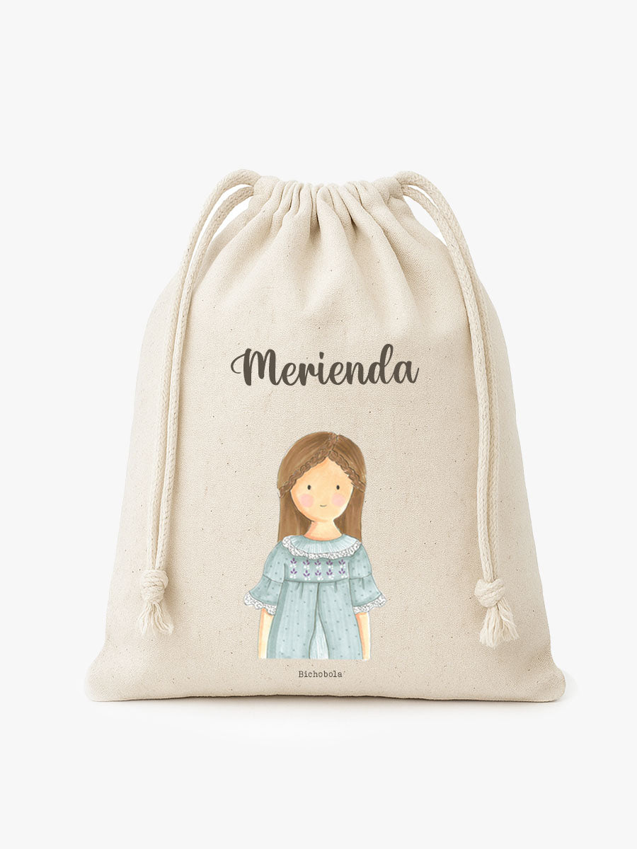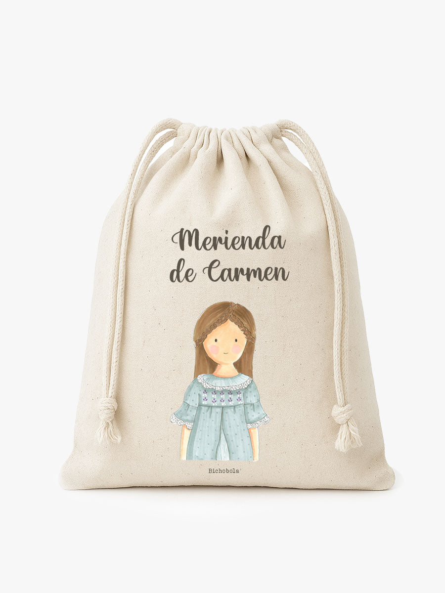 Nuestro saquito de merienda, es ideal para que los niños puedan llevar la merienda del colegio de una forma organizada y cómoda. Se puede elegir el diseño que más te guste y personalizar con el nombre del niño para que lo tenga siempre localizado. Está fabricado con algodón 100% y se cierra con cuerdas.