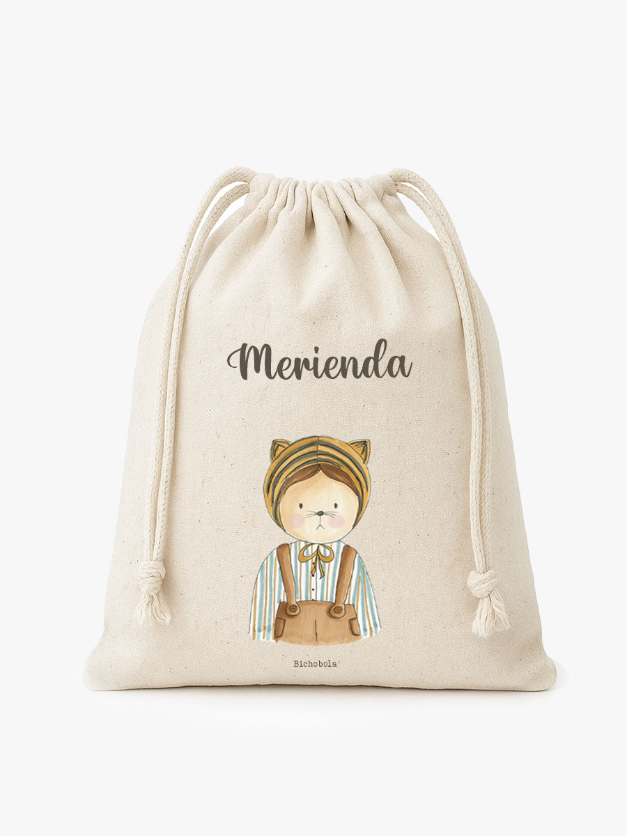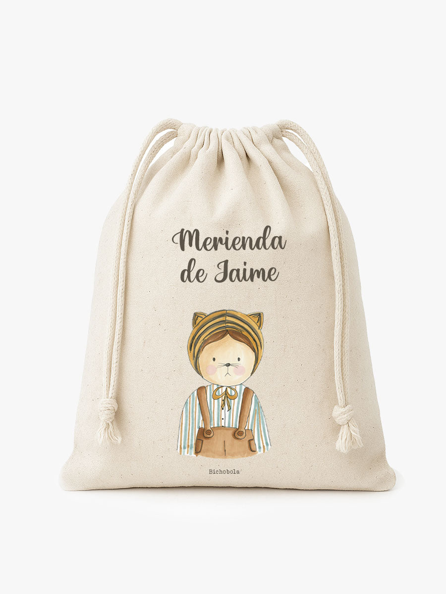 Nuestro saquito de merienda, es ideal para llevar la merienda de los más pequeños de una forma organizada y cómoda. Se puede elegir el diseño que más te guste y personalizar con el nombre del niño para que lo tenga siempre localizado. Está fabricado con algodón 100% y se cierra con cuerdas.