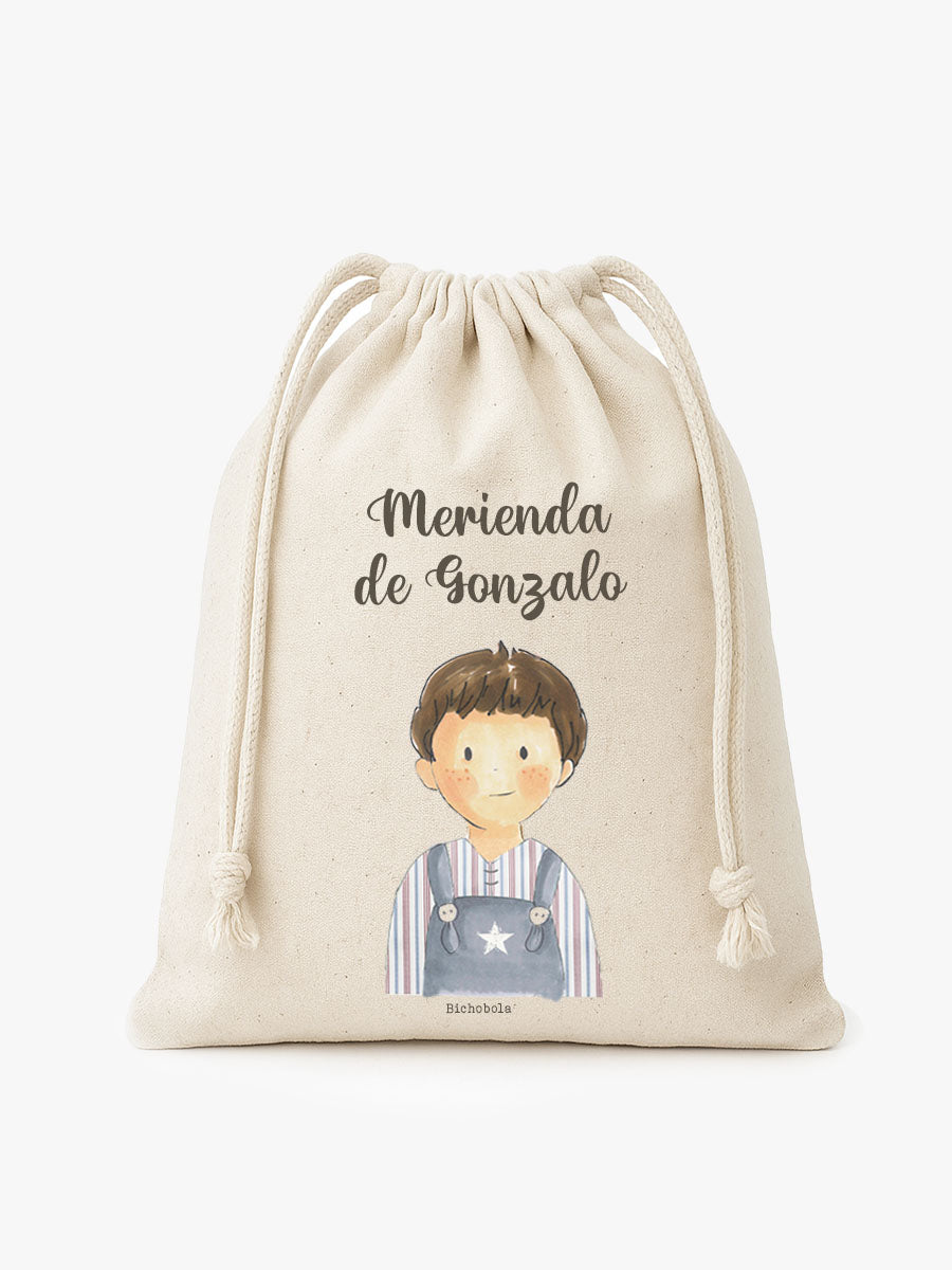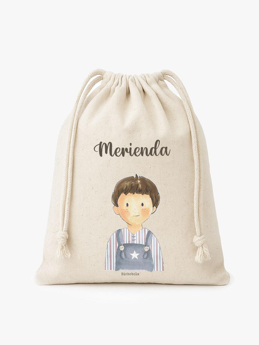 Nuestro saquito de merienda, es ideal para que los niños puedan llevar la merienda del colegio de una forma organizada y cómoda. Se puede elegir el diseño que más te guste y personalizar con el nombre del niño para que lo tenga siempre localizado. Está fabricado con algodón 100% y se cierra con cuerdas.
