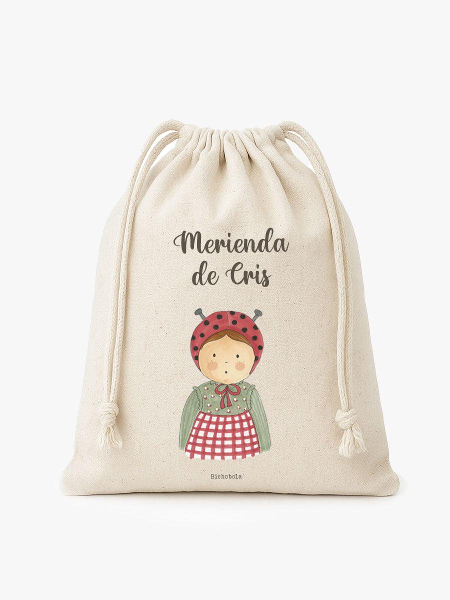 Nuestro saquito de merienda, es ideal para llevar la merienda de los más pequeños de una forma organizada y cómoda. Se puede elegir el diseño que más te guste y personalizar con el nombre del niño para que lo tenga siempre localizado. Está fabricado con algodón 100% y se cierra con cuerdas.