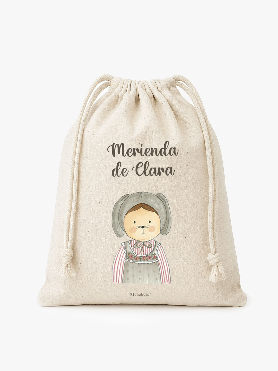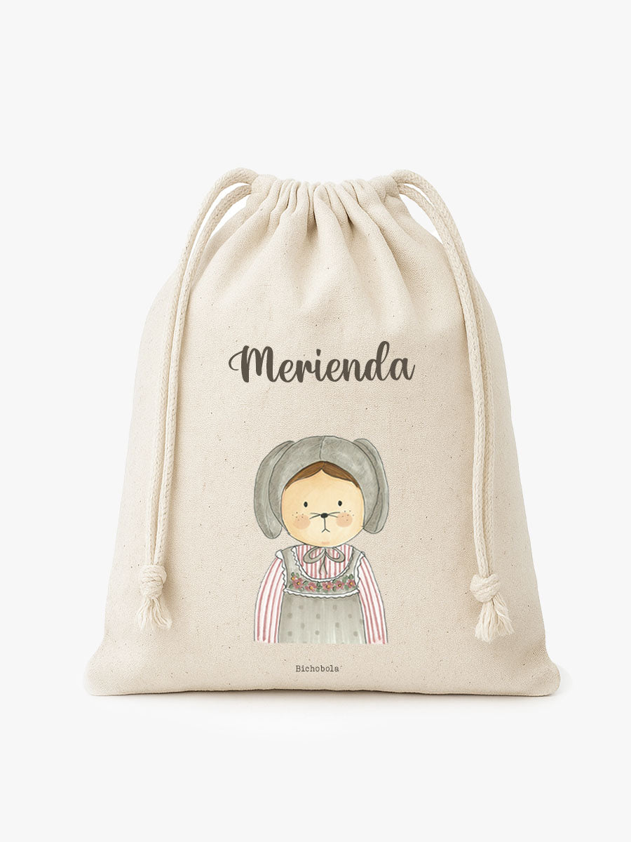 Nuestro saquito de merienda, es ideal para llevar la merienda de los más pequeños de una forma organizada y cómoda. Se puede elegir el diseño que más te guste y personalizar con el nombre del niño para que lo tenga siempre localizado. Está fabricado con algodón 100% y se cierra con cuerdas.