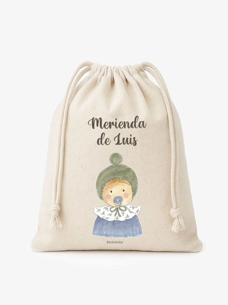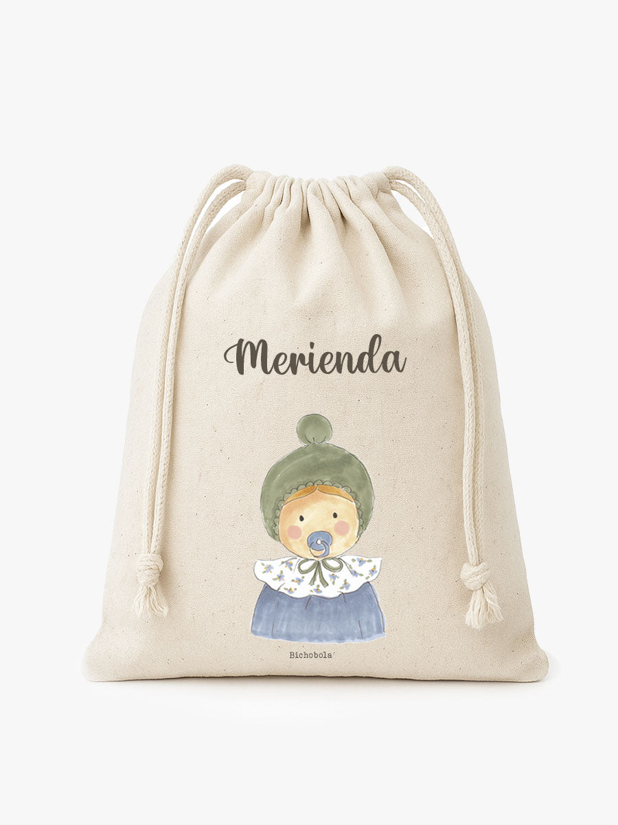 Nuestro saquito de merienda, es ideal para llevar la merienda de los más pequeños de una forma organizada y cómoda. Se puede elegir el diseño que más te guste y personalizar con el nombre del niño para que lo tenga siempre localizado. Está fabricado con algodón 100% y se cierra con cuerdas.