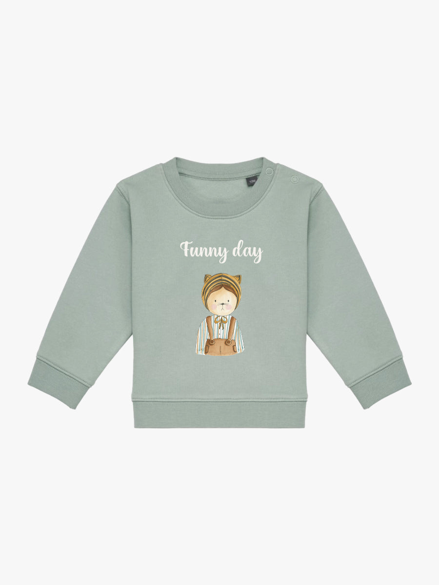 Sudadera de bebé con cuello redondo y diseño Javi el Fiera en la parte trasera. Fabricada con algodón orgánico. Es una prenda cómoda y suave, ideal para los más pequeños de la casa.